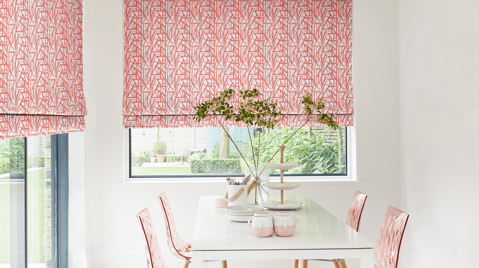 One of the delights of Roman blinds is that despite the style having been around for many many years, all it takes is some modern fabric to bring it right up to date. This contemporary dining area is kept chic and clear with the matching blinds to windows and patio doors in eye-catching Pippin Red.