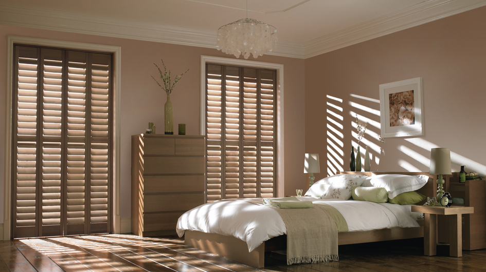 When a room has to perform a dual function such as this bedroom with a work area, it can be tricky to accommodate both functions simultaneaously. Our Full Height shutters, seen here in Amazonia, a bold colour in our new Harlequin colour shutter range, keep a clean and uncluttered look directly behind the work desk, which still allows easy access to open, close and adjust the shutters, while the colour co-ordinates with the bedroom function, matching the bedding and accessories for a look that combines function and style.