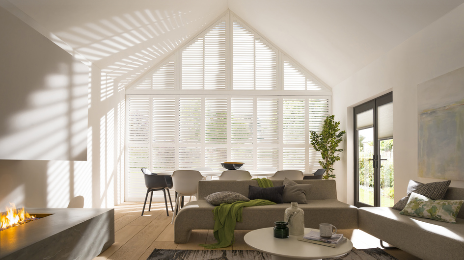 Our experience in creating shaped shutters makes us the ideal choice when it comes to window dressings for stunning architectural features such as this gable end.